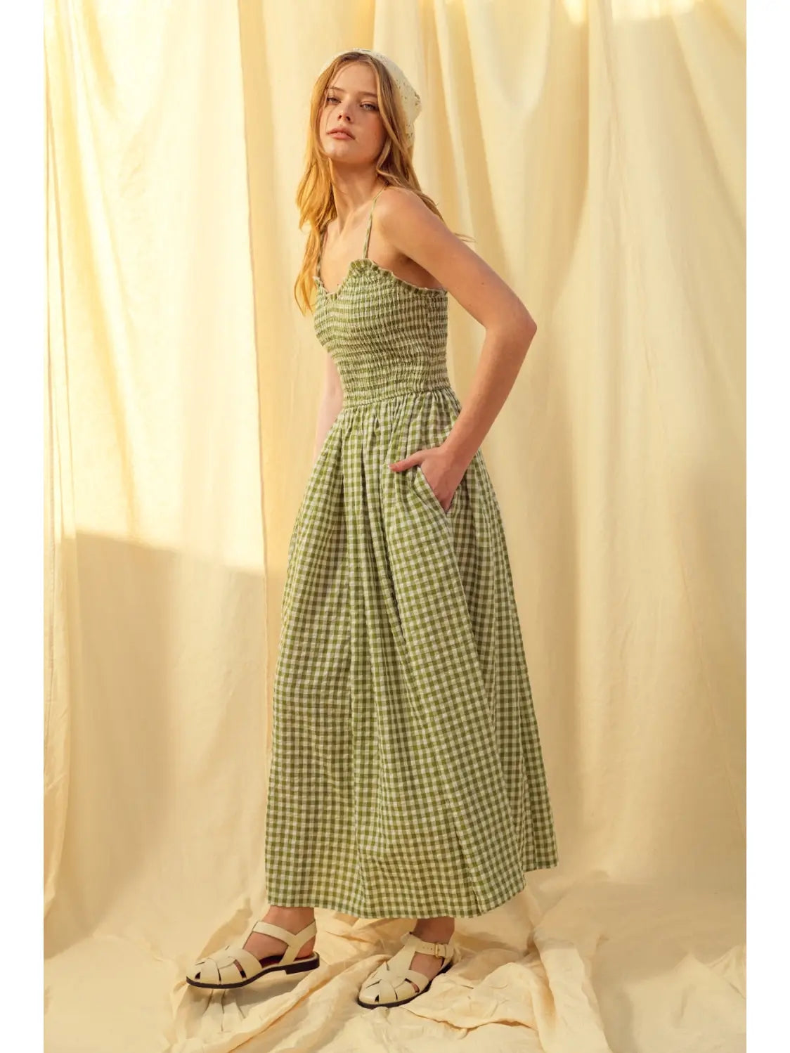GINGHAM PRINT LONG DRESS - GREEN