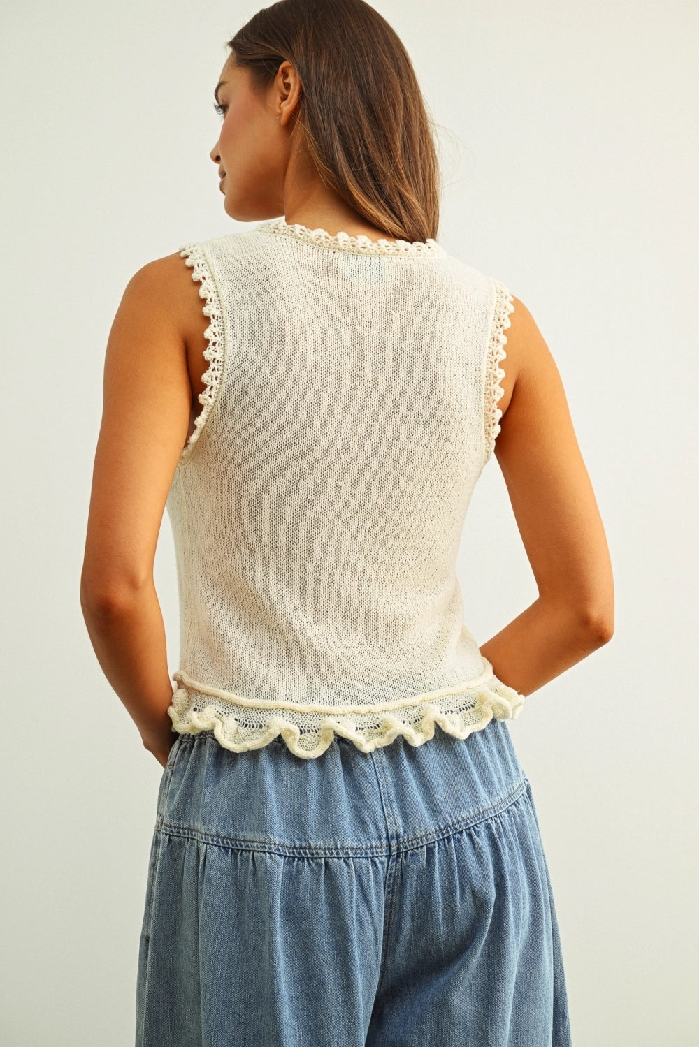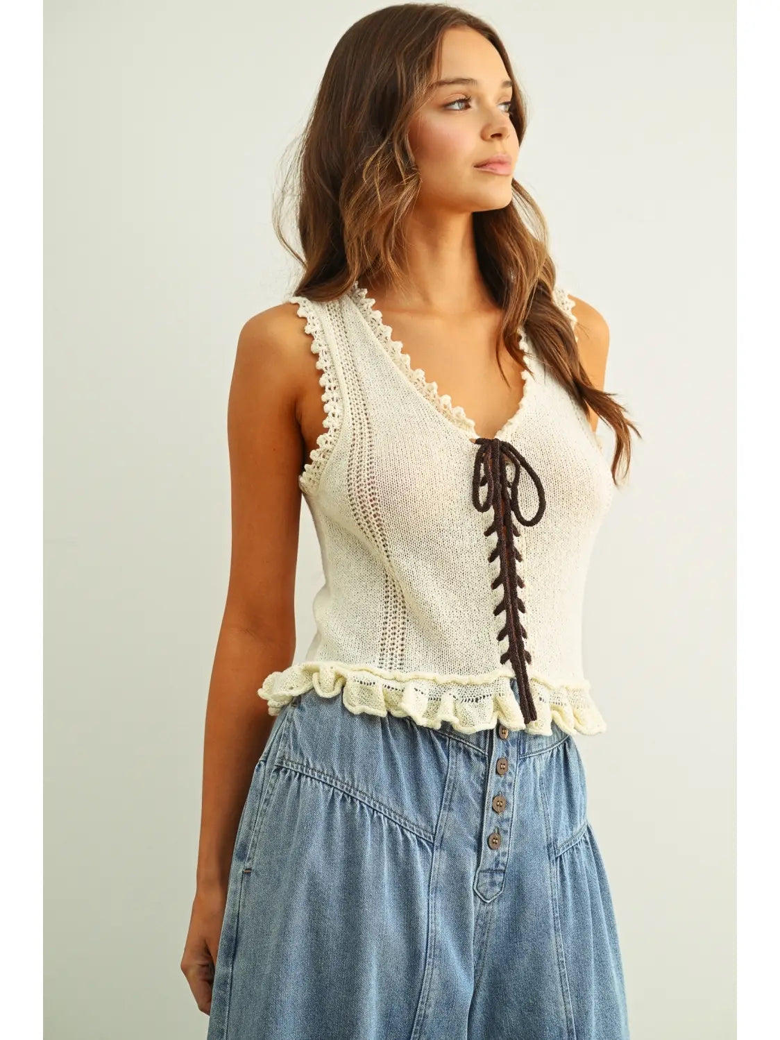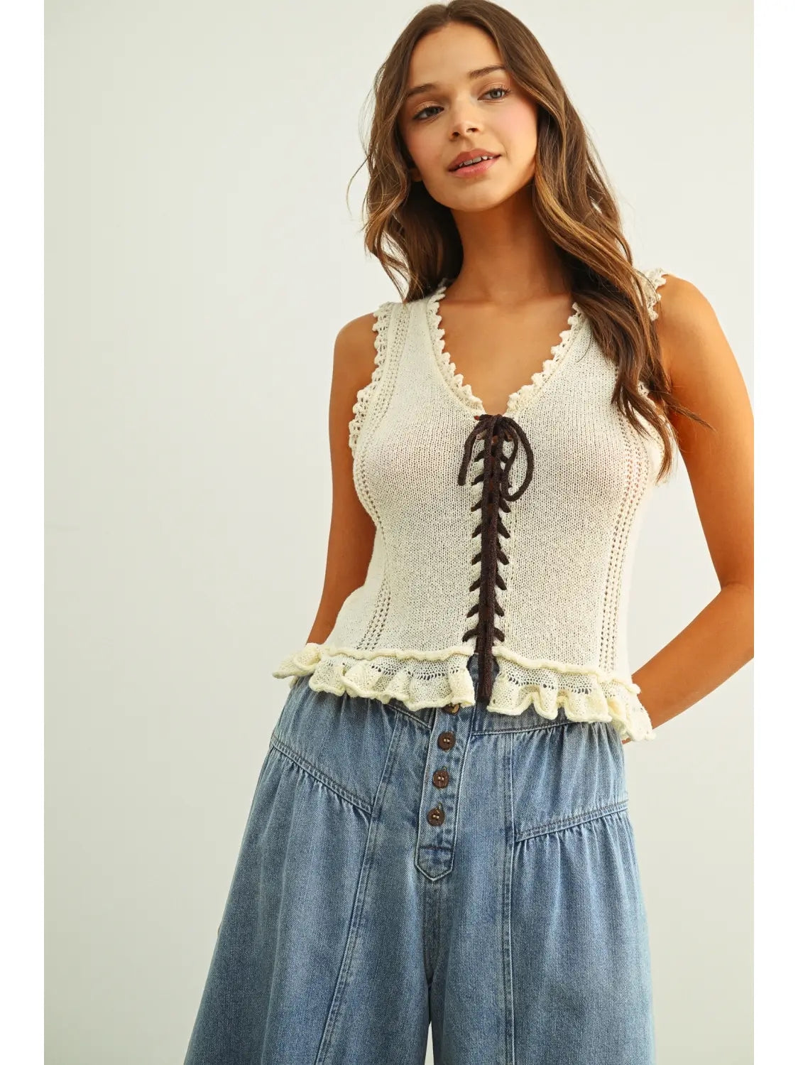 LACE UP FRONT KNIT TOP - CREAM/BROWN